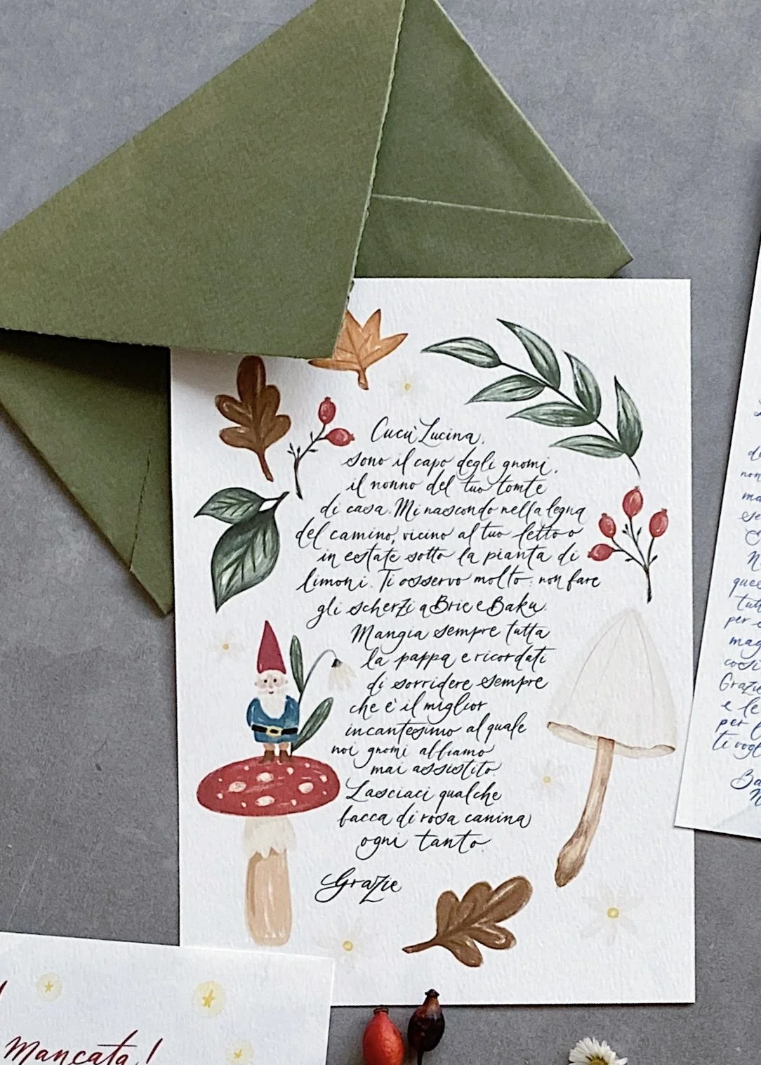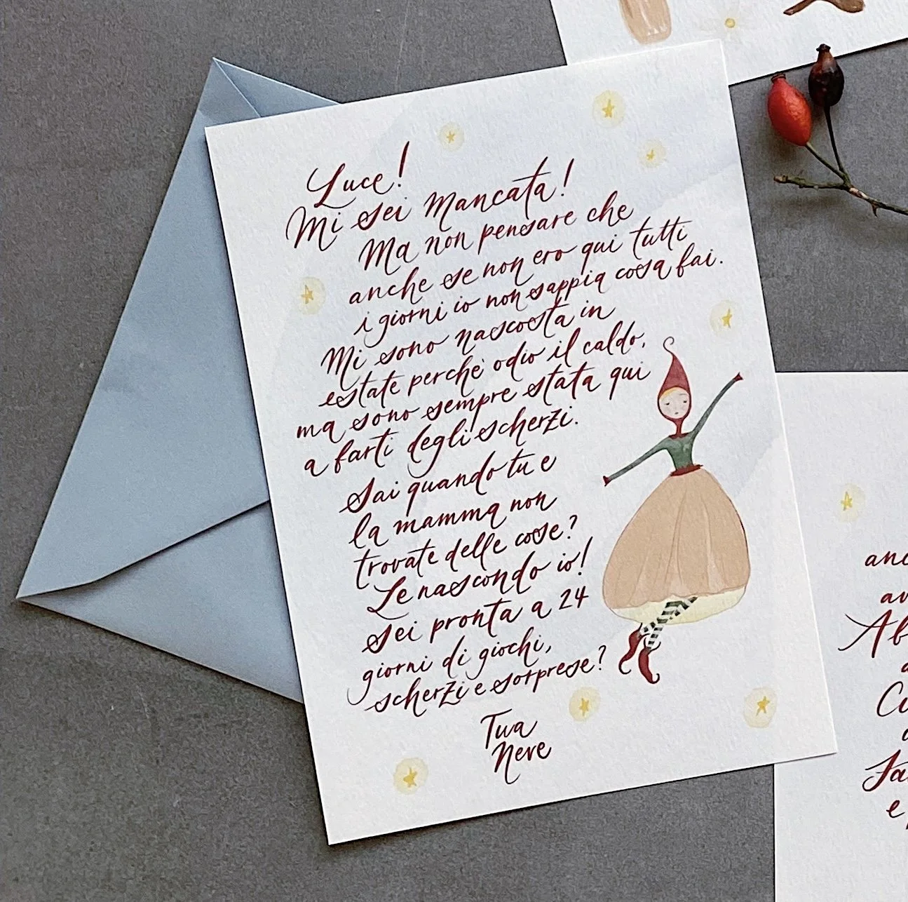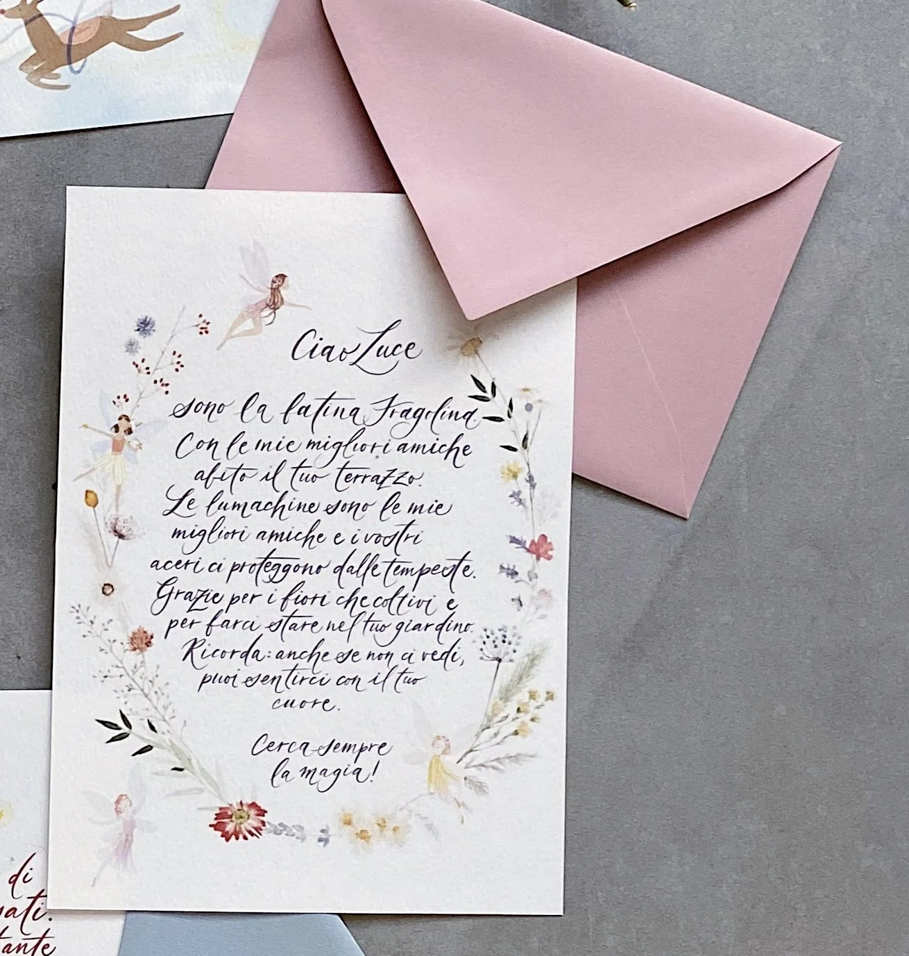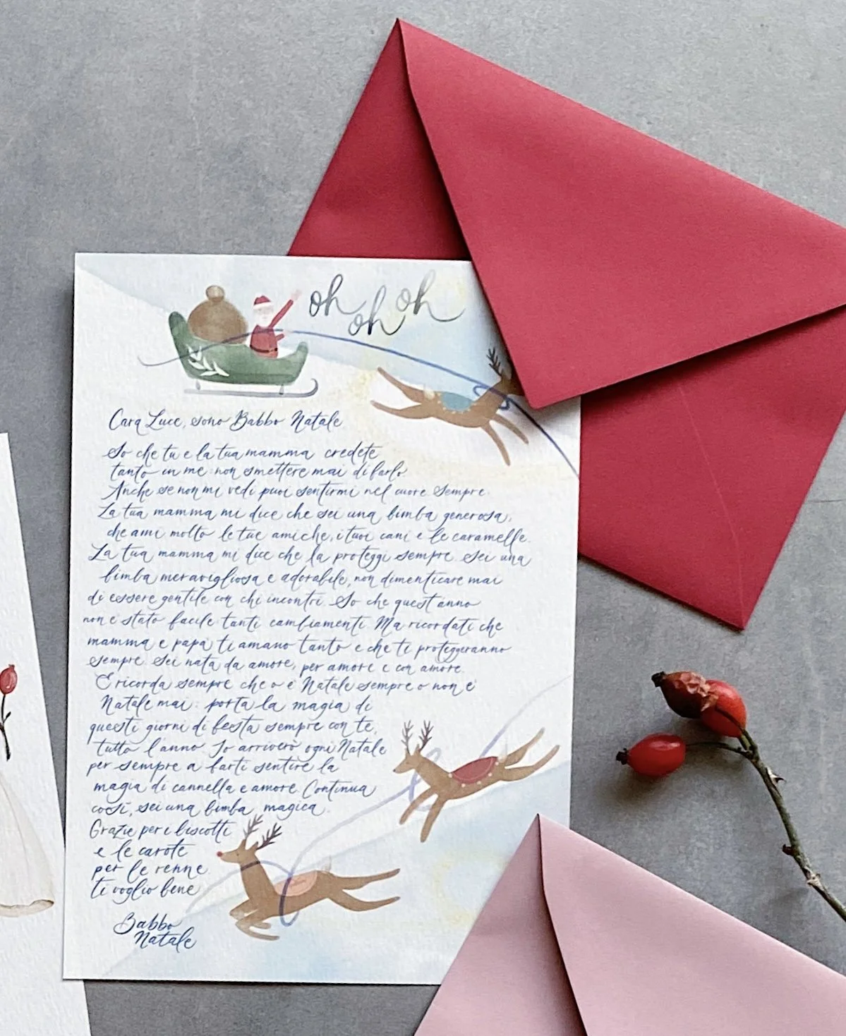 Vuoi scrivere una lettera al tuo bambino o alla tua bambina per fargli vivere a pieno la magia? Quattro grafiche tra cui scegliere, il tuo testo, la mia calligrafia per creare qualcosa di unico da ricordare.