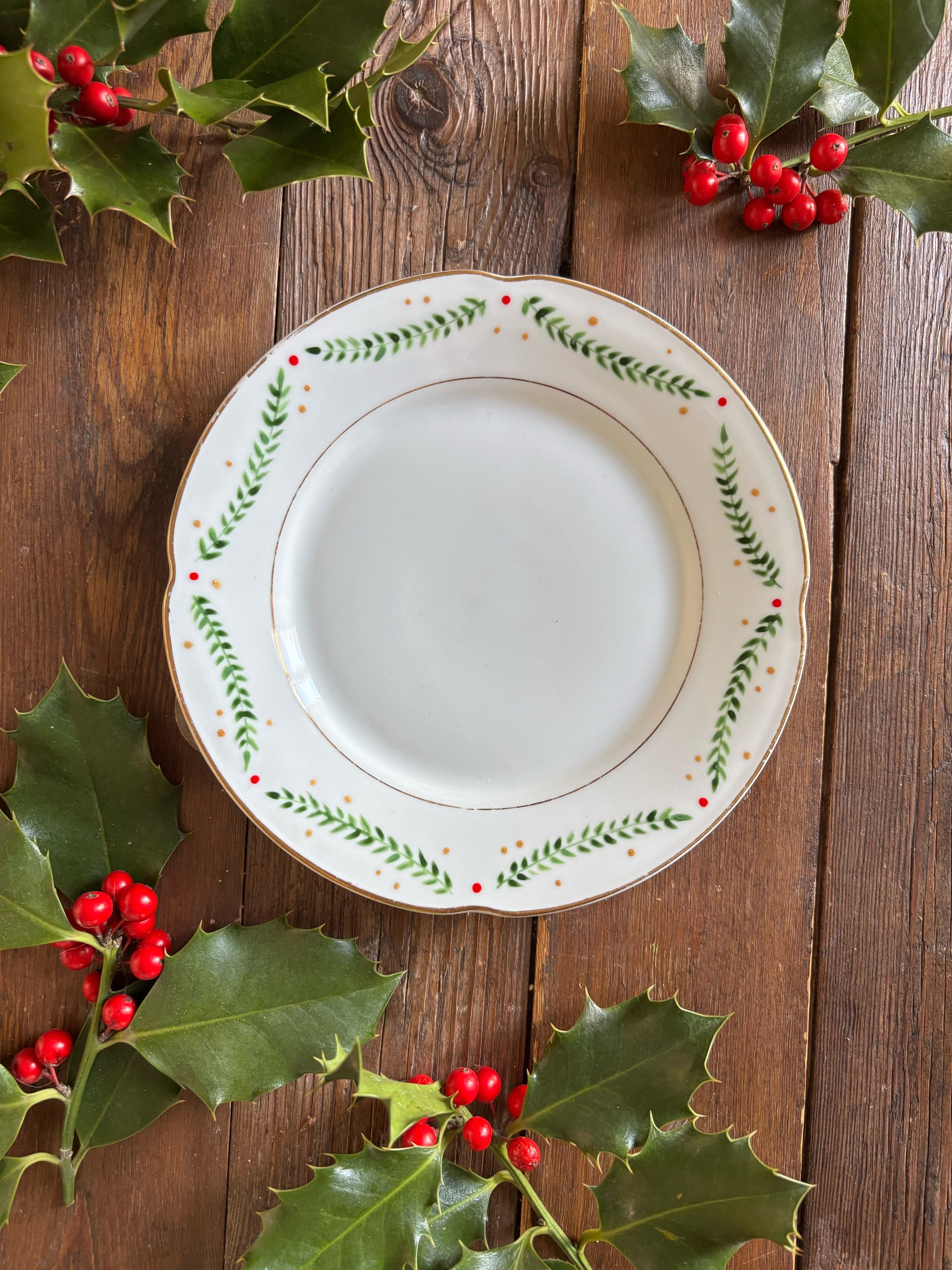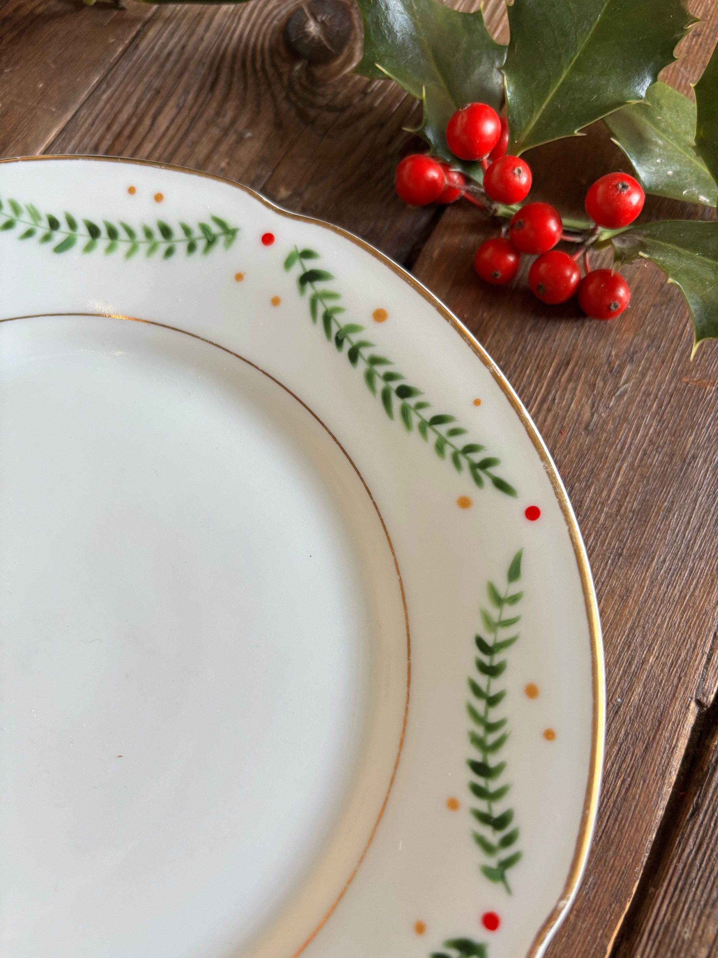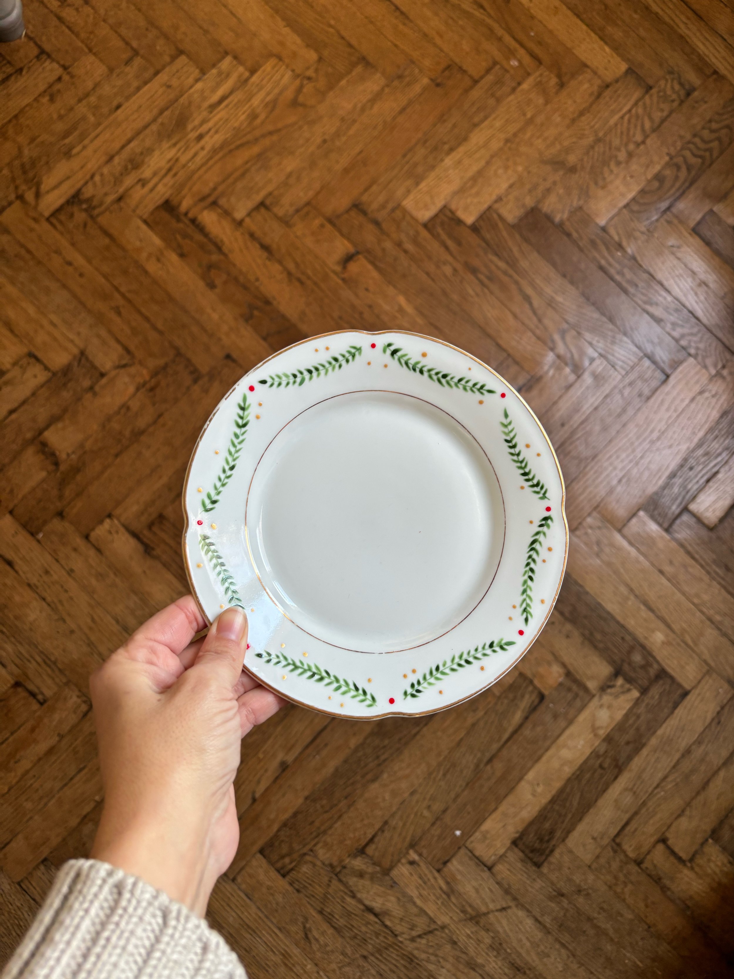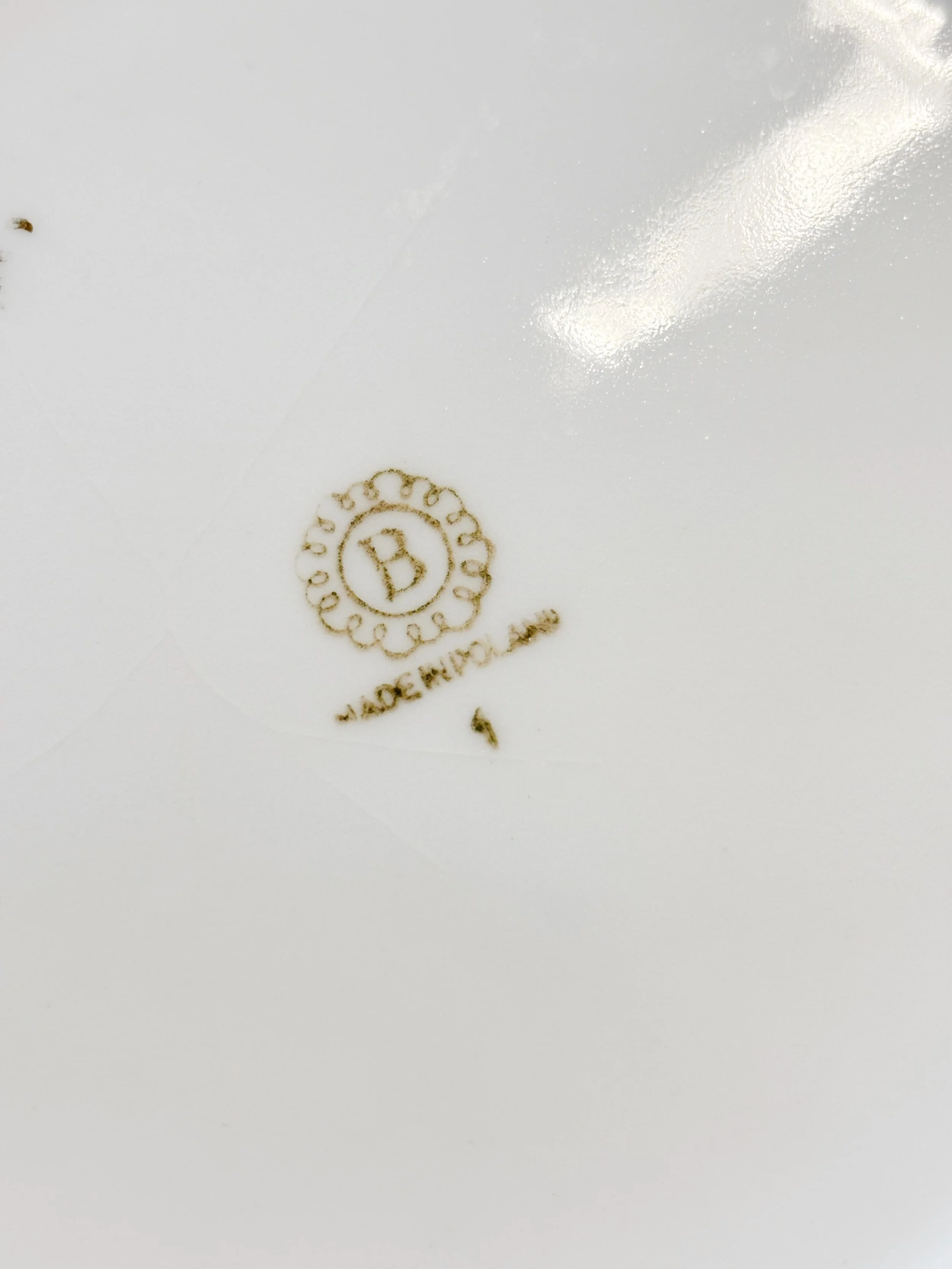 Piatto piano da dolce, in porcellana dipinto a mano, marcato “Sesto Del Vivo, Firenze”, realizzato nel 1950, filo oro.
