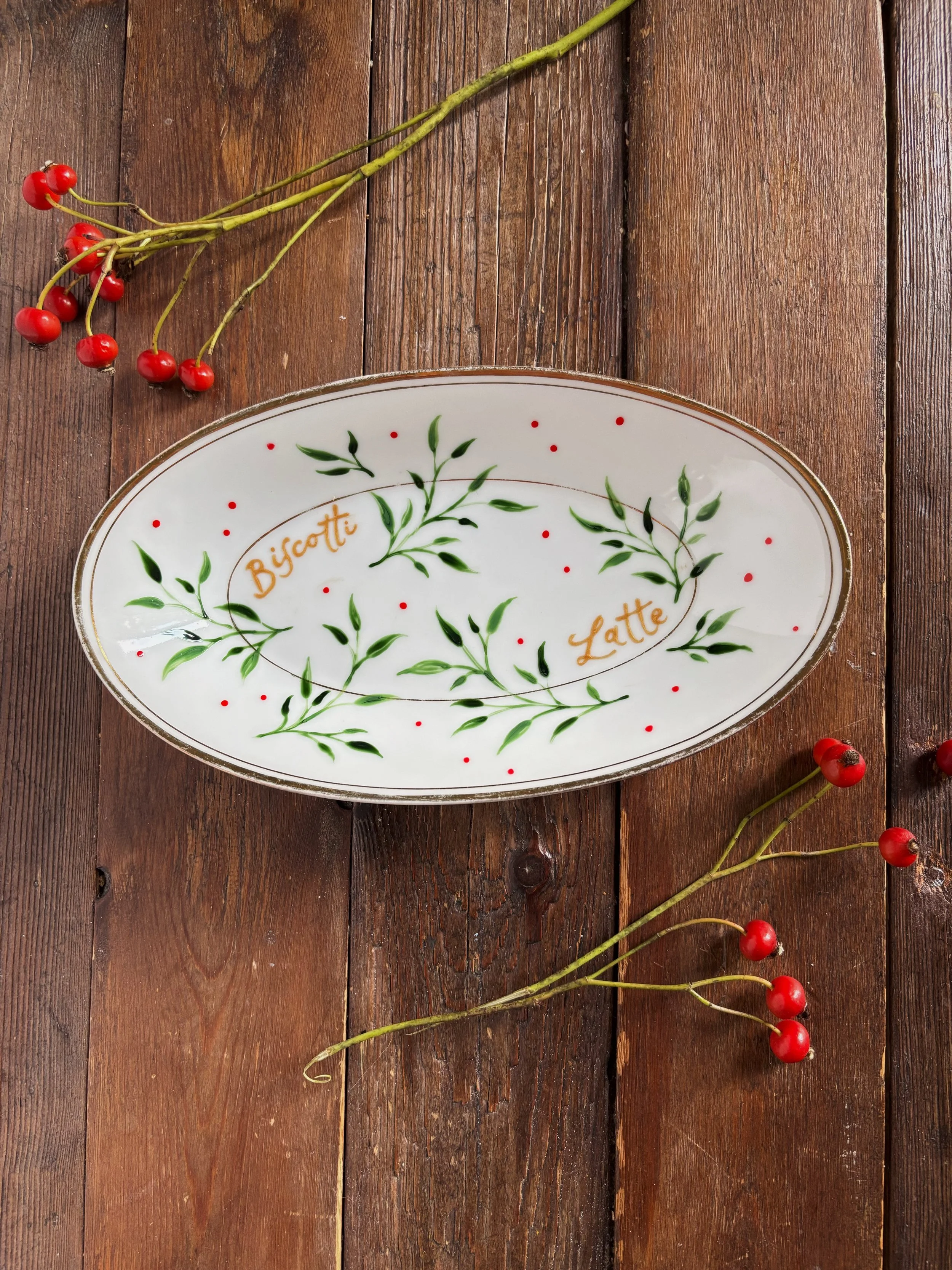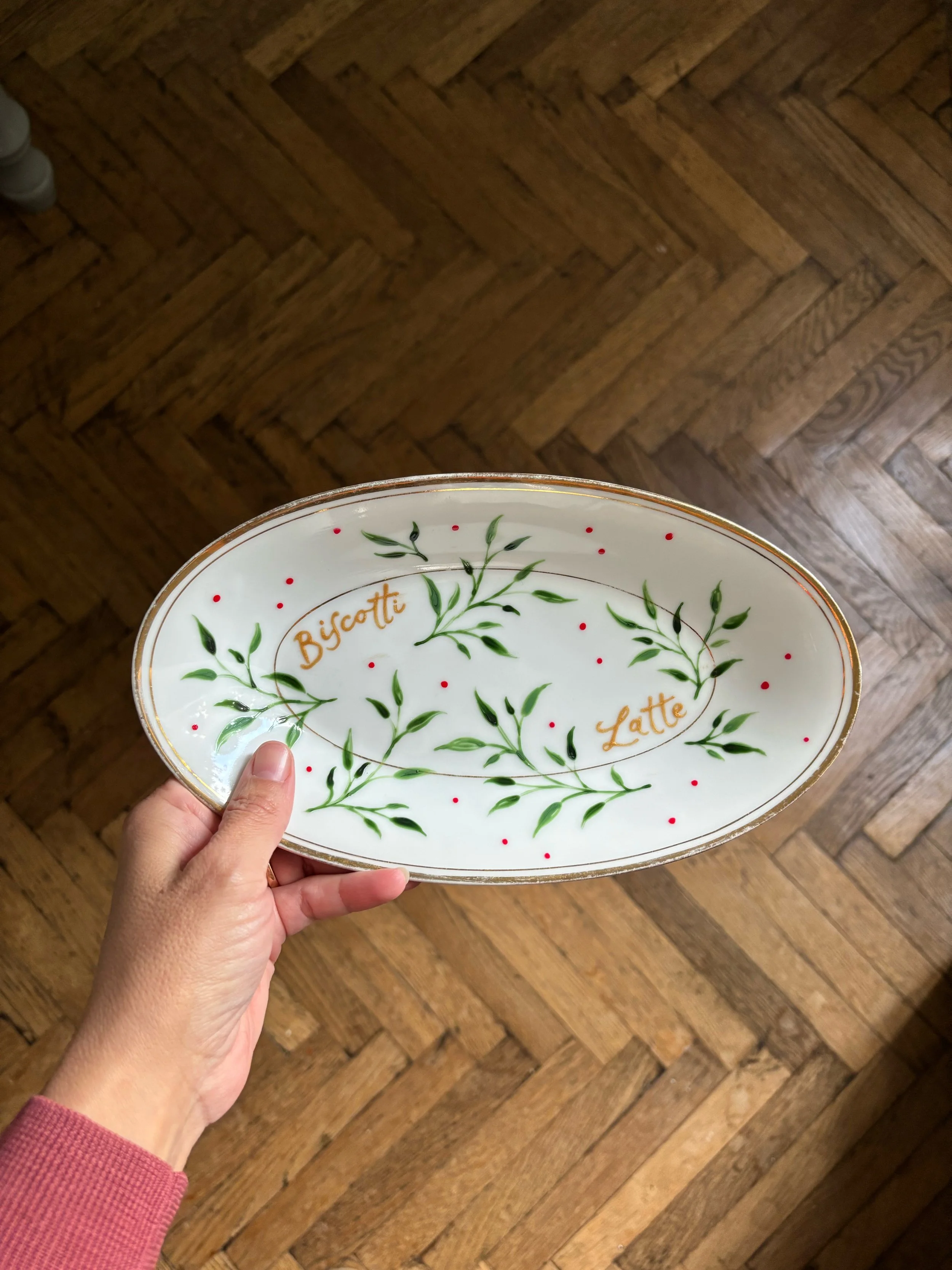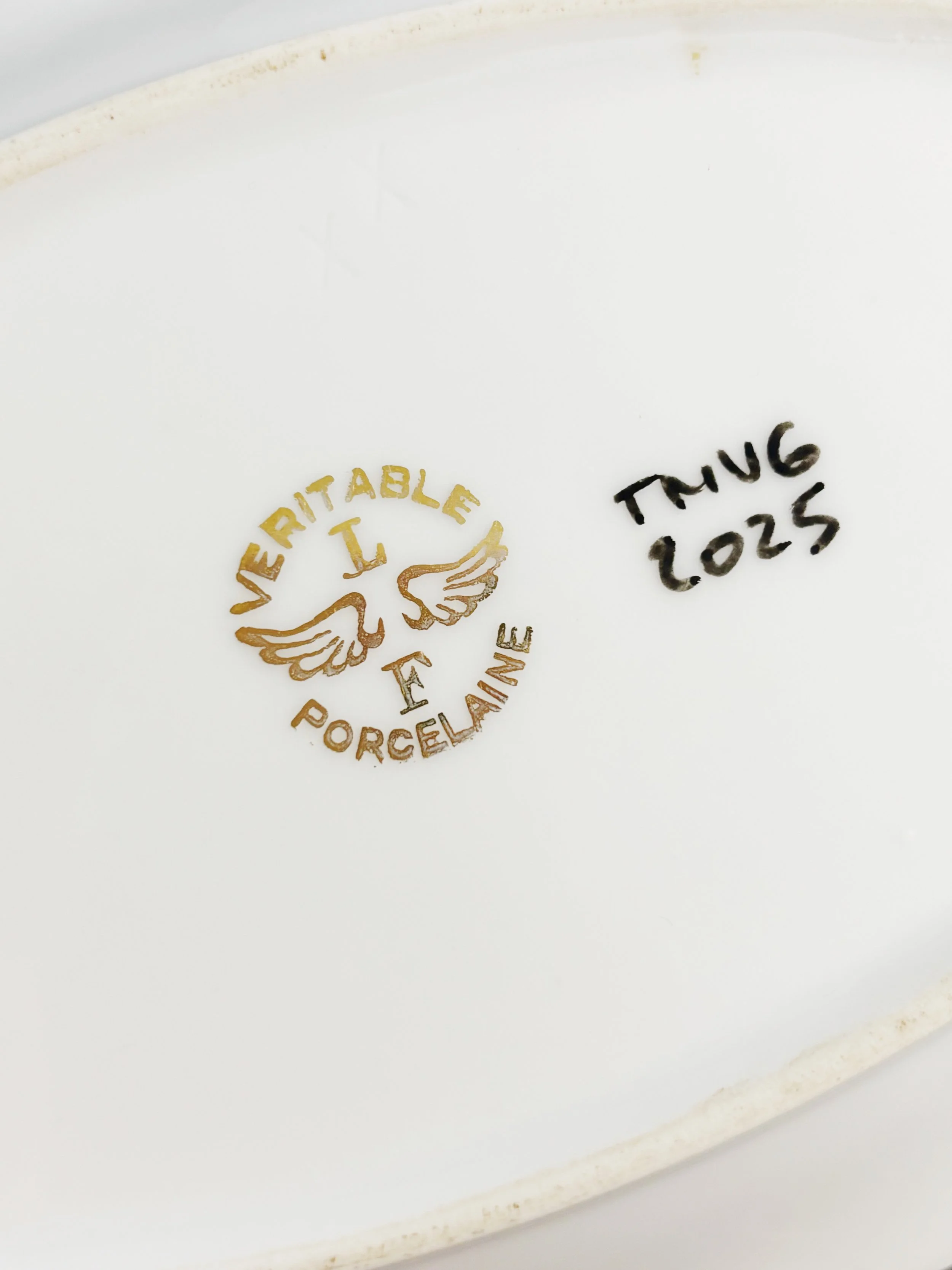 Vassoietto ovale, in porcellana dipinto a mano, marcato Veritable L F Porcelaine, parte della produzione Limonge tra gli anni ‘50 e ‘60 del 900, con filo oro.
