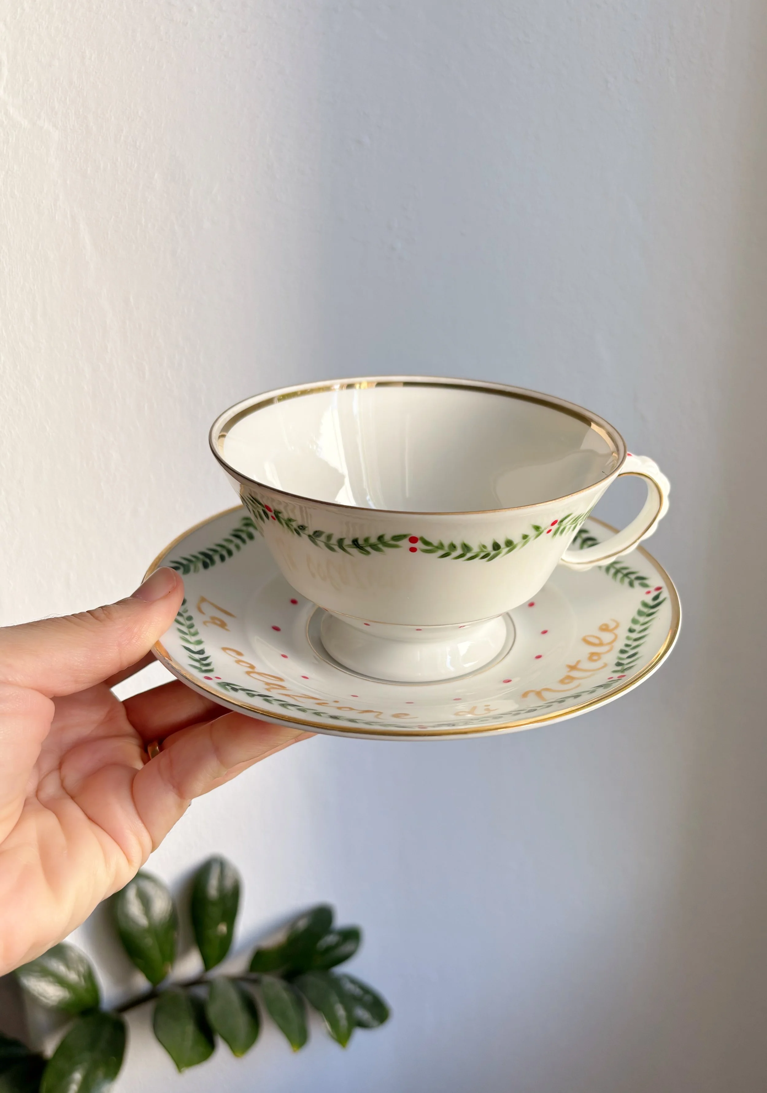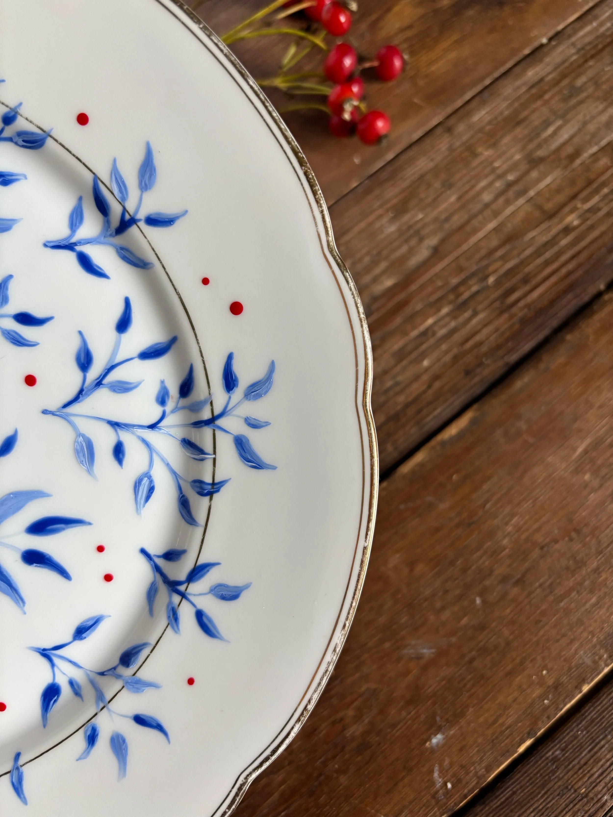 Piattino da dolce in porcellana dipinto a mano, marcato Johann Seltmann Vohenstrauss 1691 54 Bavaria, (Germania Ovest) prodotto all’incirca tra gli anni ‘40 e ‘50 del 900, con bordo filo oro.
