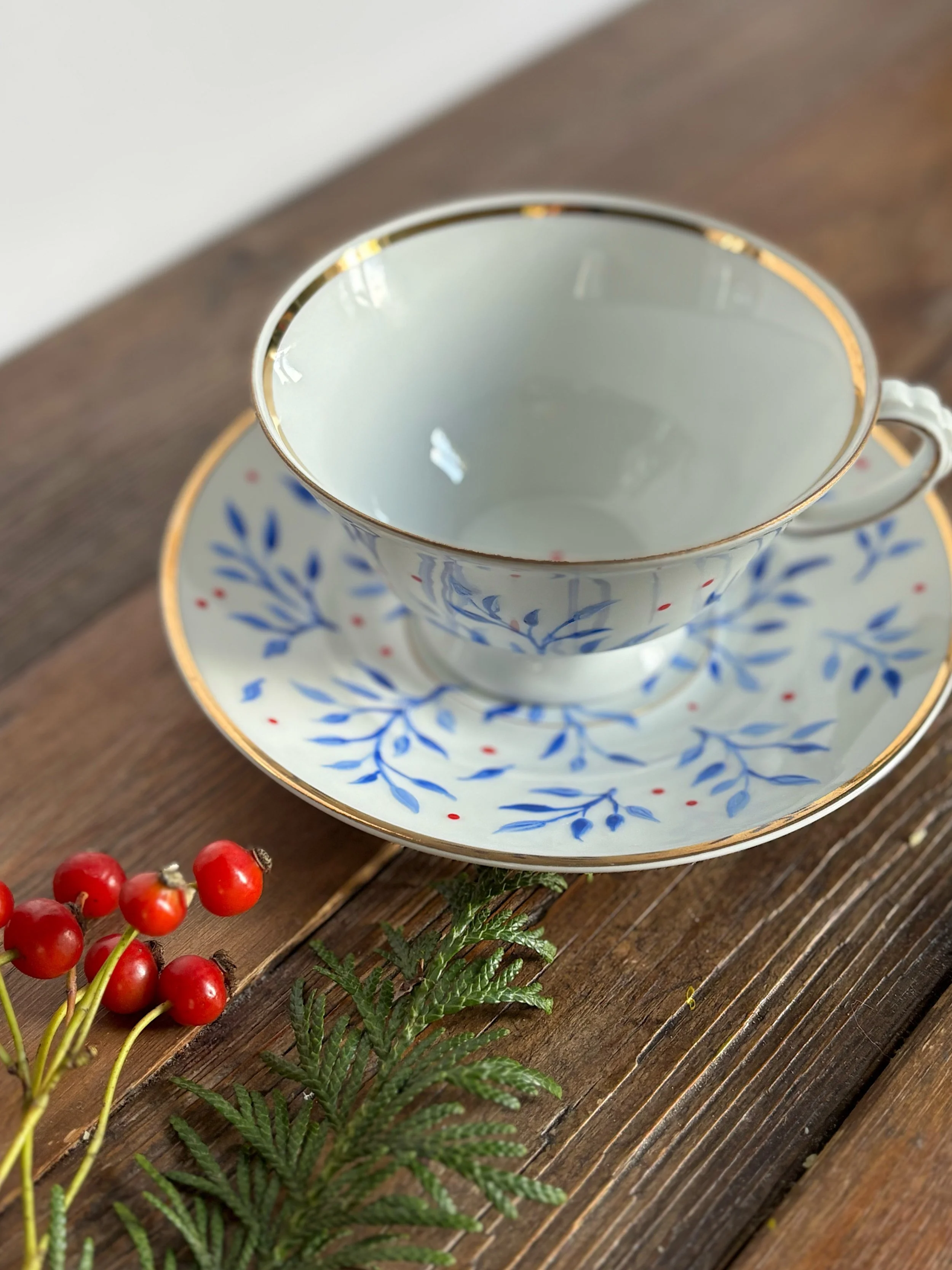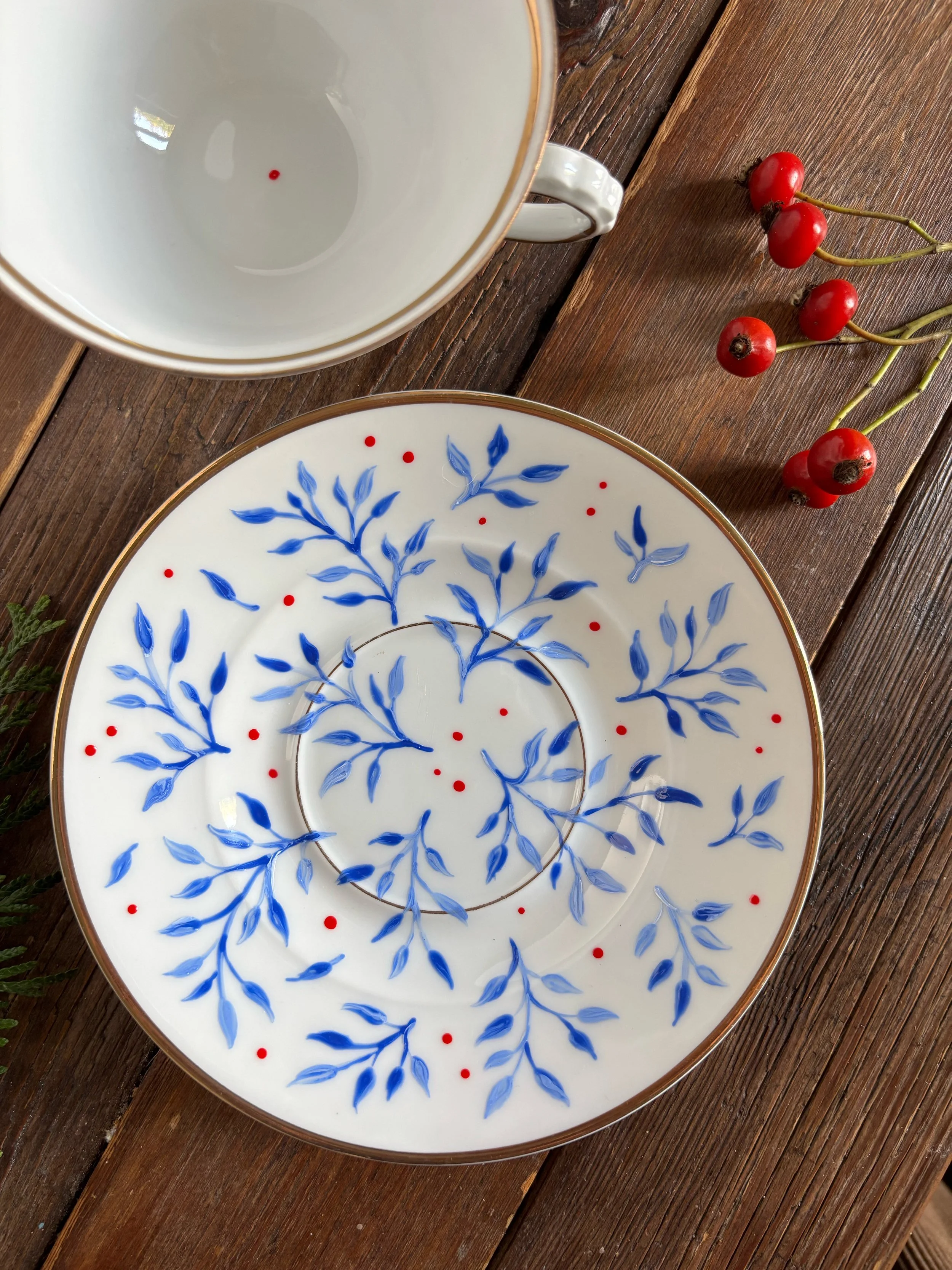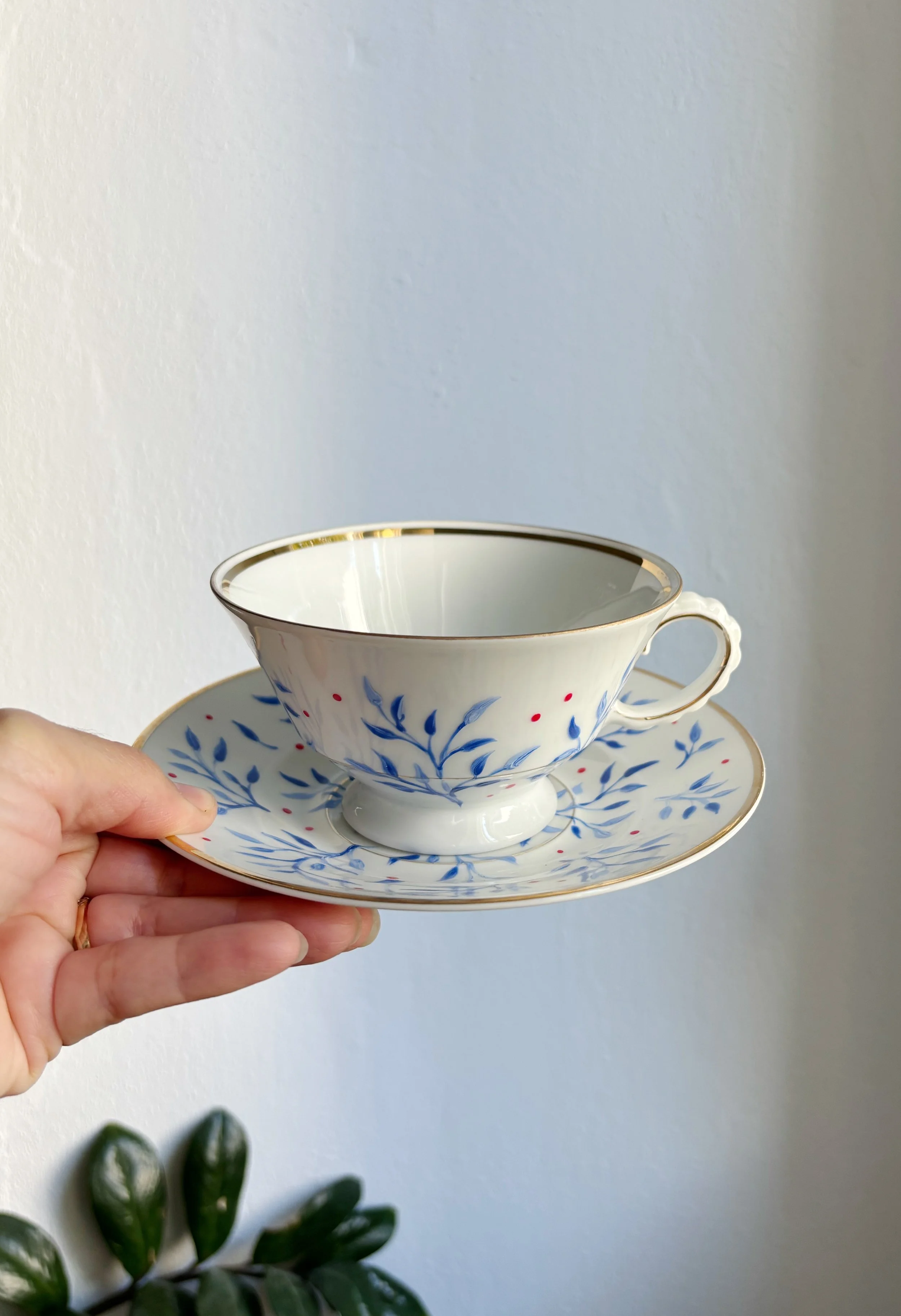 Set composto da 2 tazzine da caffè e piattini con decoro leggermente in rilievo, in porcellana dipinta a mano, marcate Porcelana Real Batalha, Portogallo, realizzate tra egli anni ‘50 ‘70 del ‘900.